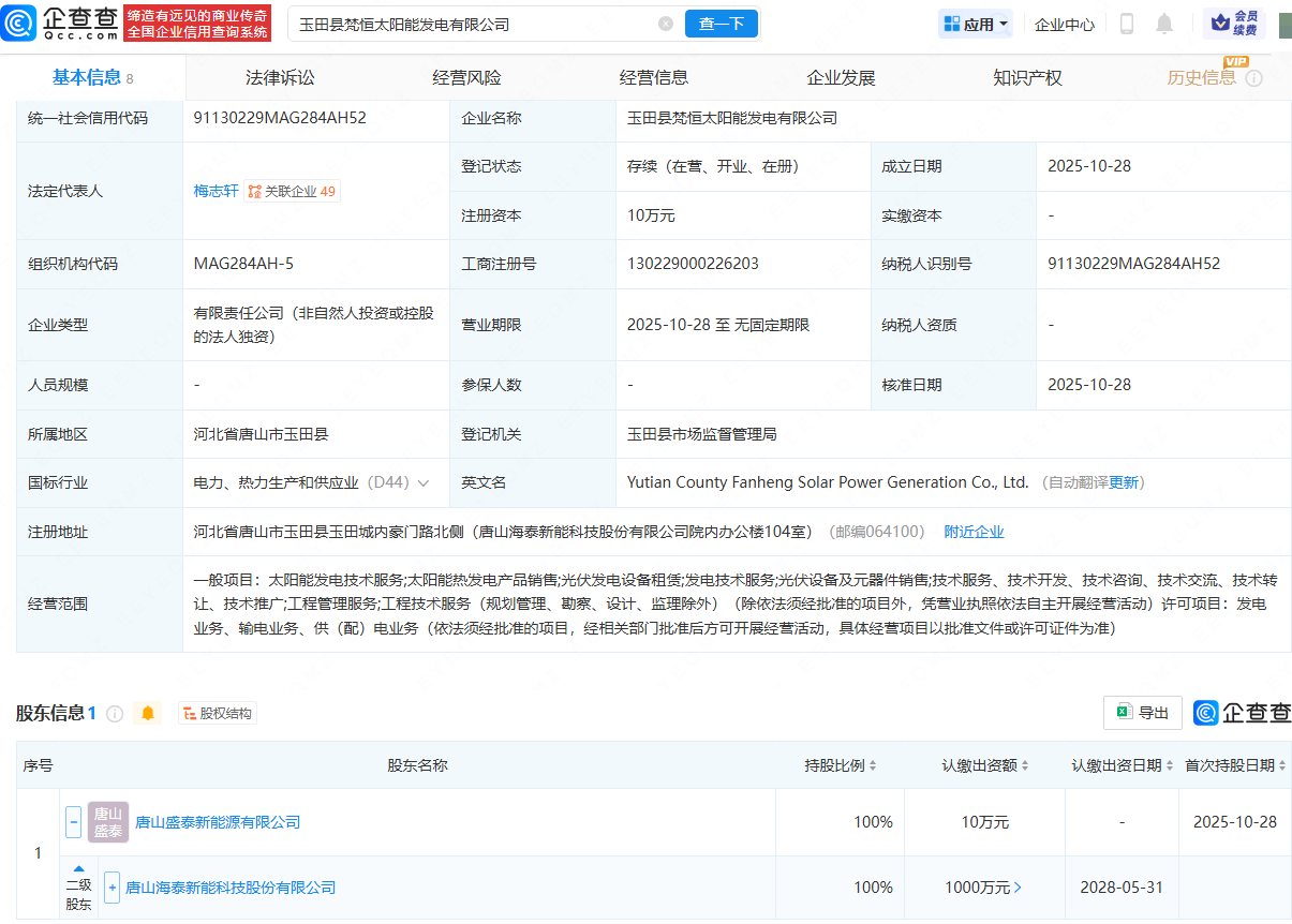 近日,玉田县梵恒太阳能发电有限公司成立,法定代表人为梅志轩,经营范围包含:太阳能发电技术服务;太阳能热发电产品销售;光伏发电设备租赁;发电技术服务;发电业务、输电业务、供(配)电业务等。企查查股权穿透显示,该公司由海泰新能(920985)间接全资持股。
